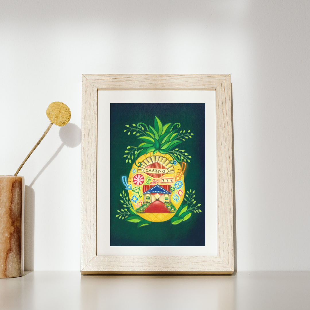 The Pineapple Casino blends glowing yellows with whimsical signage to create a magical late-night landmark with a fruity twist.